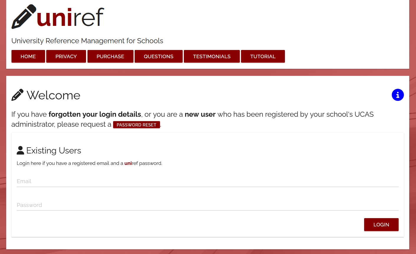 If your UCAS administrator has registered you, uniref will have a username recorded for you, but no password until you request one. Click on Password Reset, then enter your email address (usually a school email address) and click on Request a Password.